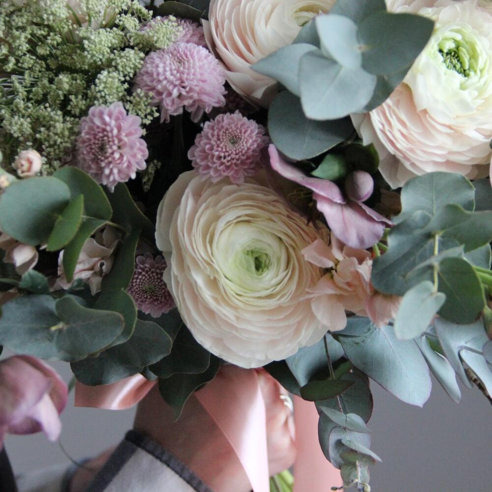магнолия ветки – 2 шт.Ранункулюс – 3 шт.Амми – 3 шт.Маттиола – 3 шт.Хелеборус – 2 шт.Хризантема момоко – 2 шт.авена – 3 шт.Сантини – 2 шт.Эвкалипт – 5 шт.Роза кустовая пионовидная – 2 шт.Лента атласная – 1 шт.