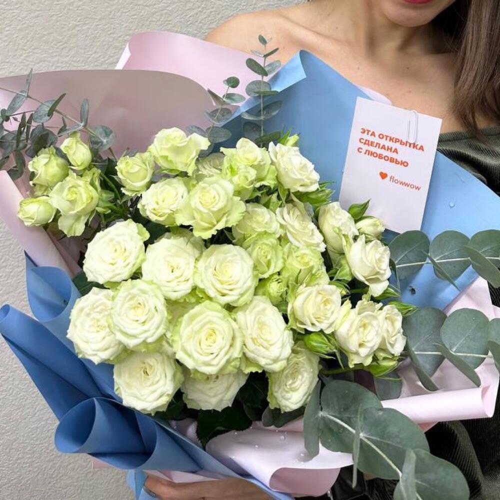 Роза кустовая – 7 шт.Эвкалипт – 1 шт.Упаковка дизайнерская – 2 шт.Лента атласная – 1 шт.