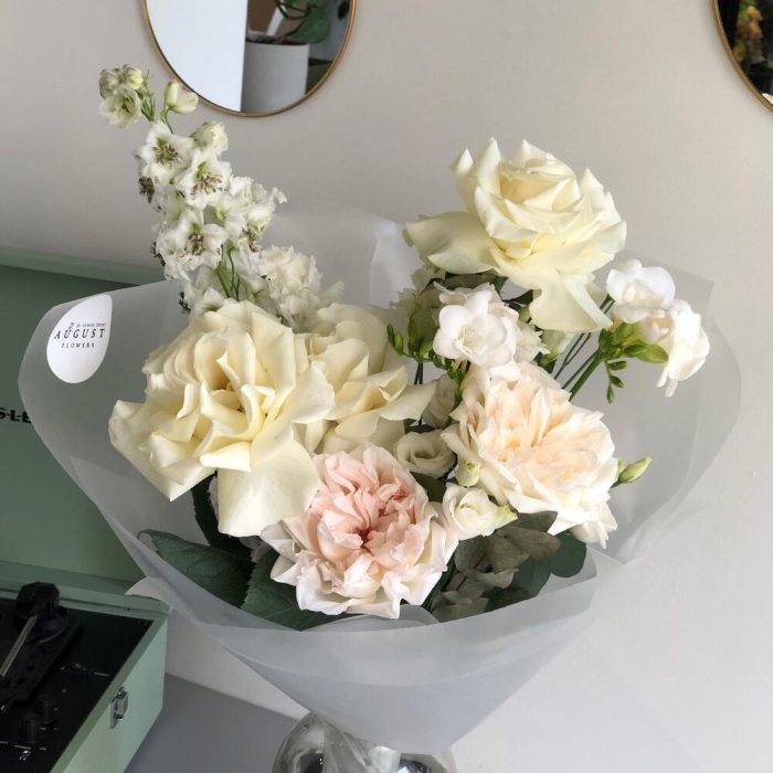 Дельфиниум – 1 шт.ферзия – 2 шт.Роза пионовидная – 2 шт.Роза сортовая – 3 шт.Лизиантус – 1 шт.Эвкалипт – 1 шт.Упаковка дизайнерская – 1 шт.