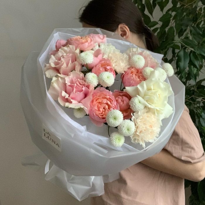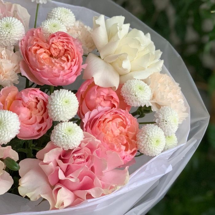 Гвоздика кремовая – 3 шт.Лента атласная – 1 шт.Упаковка дизайнерская – 2 шт.Кризал (подкормка) – 1 шт.Аквапак – 1 шт.Транспортировочная коробка – 1 шт.Роза pink mondial – 3 шт.Роза кустовая julliette – 2 шт.гвоздика белая сортовая – 1 шт.хризантема coconut – 3 шт.инструкция по уходу за цветами – 1 шт.роза playa blanca – 1 шт.