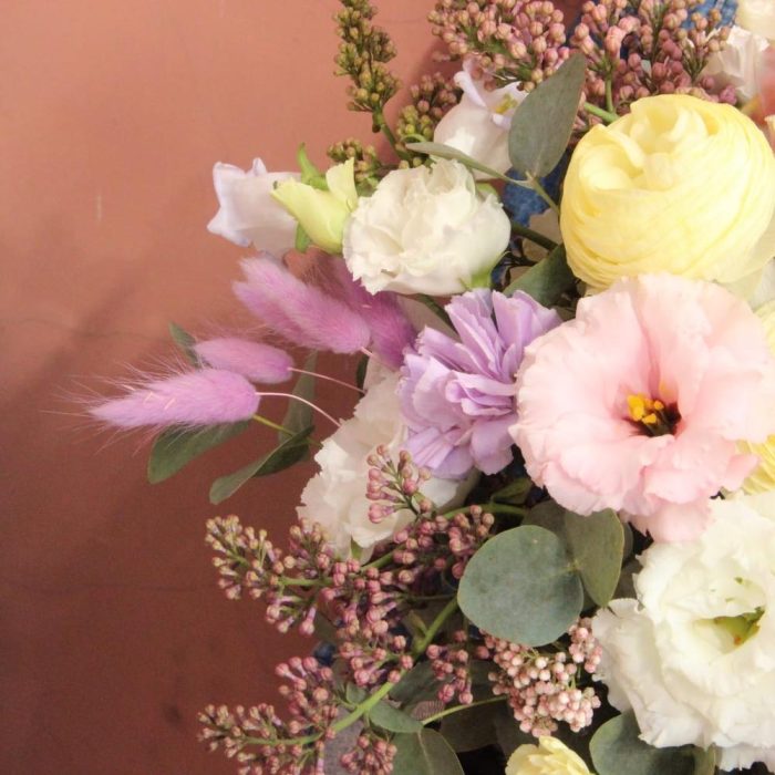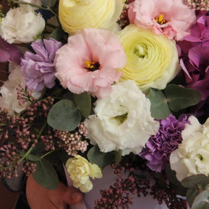 Ранункулюс – 2 шт.Роза пионовидная – 2 шт.Сирень – 2 шт.Лизиантус – 5 шт.Колокольчик – 2 шт.Антуриум – 2 шт.Гвоздика – 7 шт.Лагурус – 7 шт.Эвкалипт – 7 шт.Маттиола – 1 шт.Шляпная коробка – 1 шт.Оазис флористический – 1 шт.