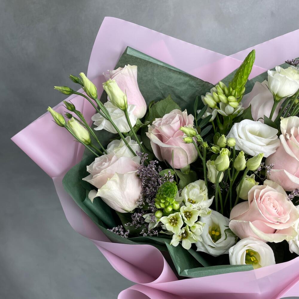 Альстромерии, Гвоздики, Кустовые розы, Лизиантусы, Розы, Хризантемы