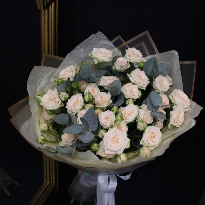 Эвкалипт – 3 шт.Лента атласная – 2 шт.Тишью – 3 шт.Пленка матовая – 3 шт.роза кустовая таня – 7 шт.