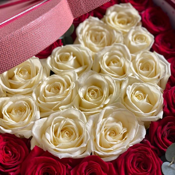 Эвкалипт – 1 шт.Оазис флористический – 1 шт.Роза red naomi – 17 шт.Коробка сердце большая – 1 шт.Роза аваланж россия – 14 шт.