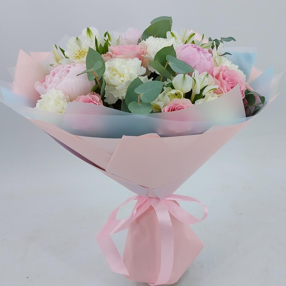 Альстромерия – 3 шт.Пион – 3 шт.Эвкалипт – 7 шт.Роза одноголовая – 9 шт.Упаковка дизайнерская – 1 шт.Пистация – 3 шт.гвоздика сортовая (диантус) – 7 шт.