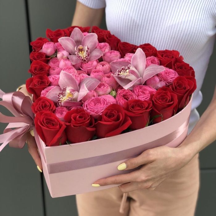 ЦИМБИДИУМ – 3 шт. Кустовая пионовидная роза – 9 шт. роза красная фридом – 21 шт. Оазис – 4 шт. Коробка сердце – 1 шт. Оформление – 1 шт.