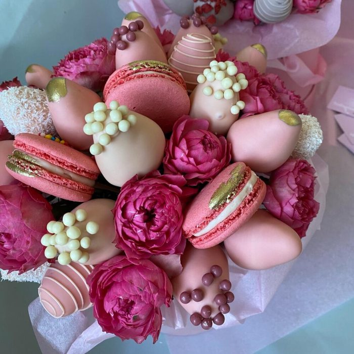 Пионовидная кустовая роза – 3 шт.макарон (пирожное) – 5 шт.Клубника в шоколаде callebaut (бельгия) – 25 шт.