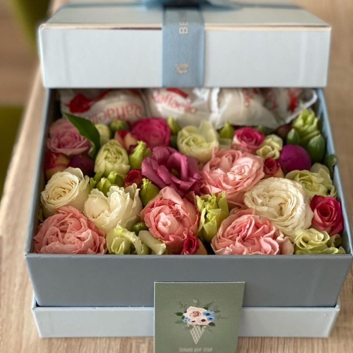 “Атлас☁️” – цветочная композиция с зефиром в деревянном ящике