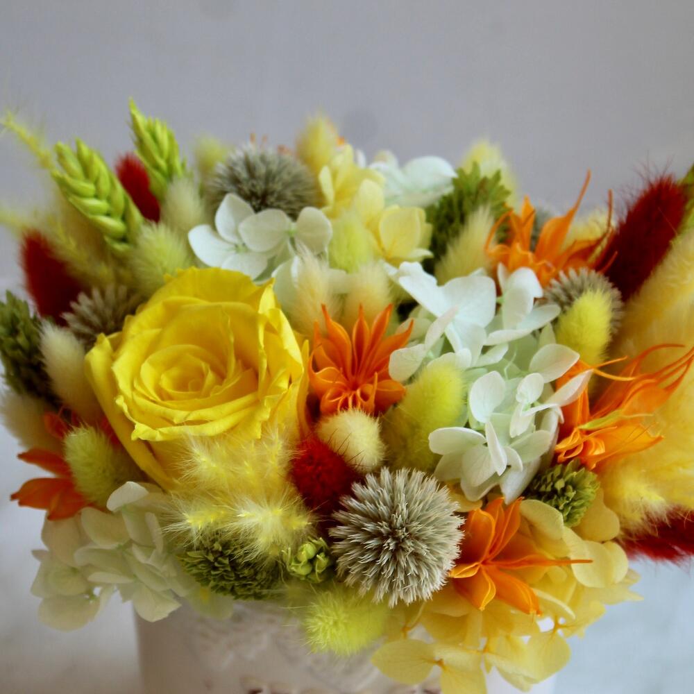 Гортензия – 1 шт.Роза – 1 шт.Колосья – 1 шт.Лагурус – 1 шт.Фаларис – 1 шт.Мордовник – 1 шт.Сетария – 1 шт.Керамическое кашпо – 1 шт.