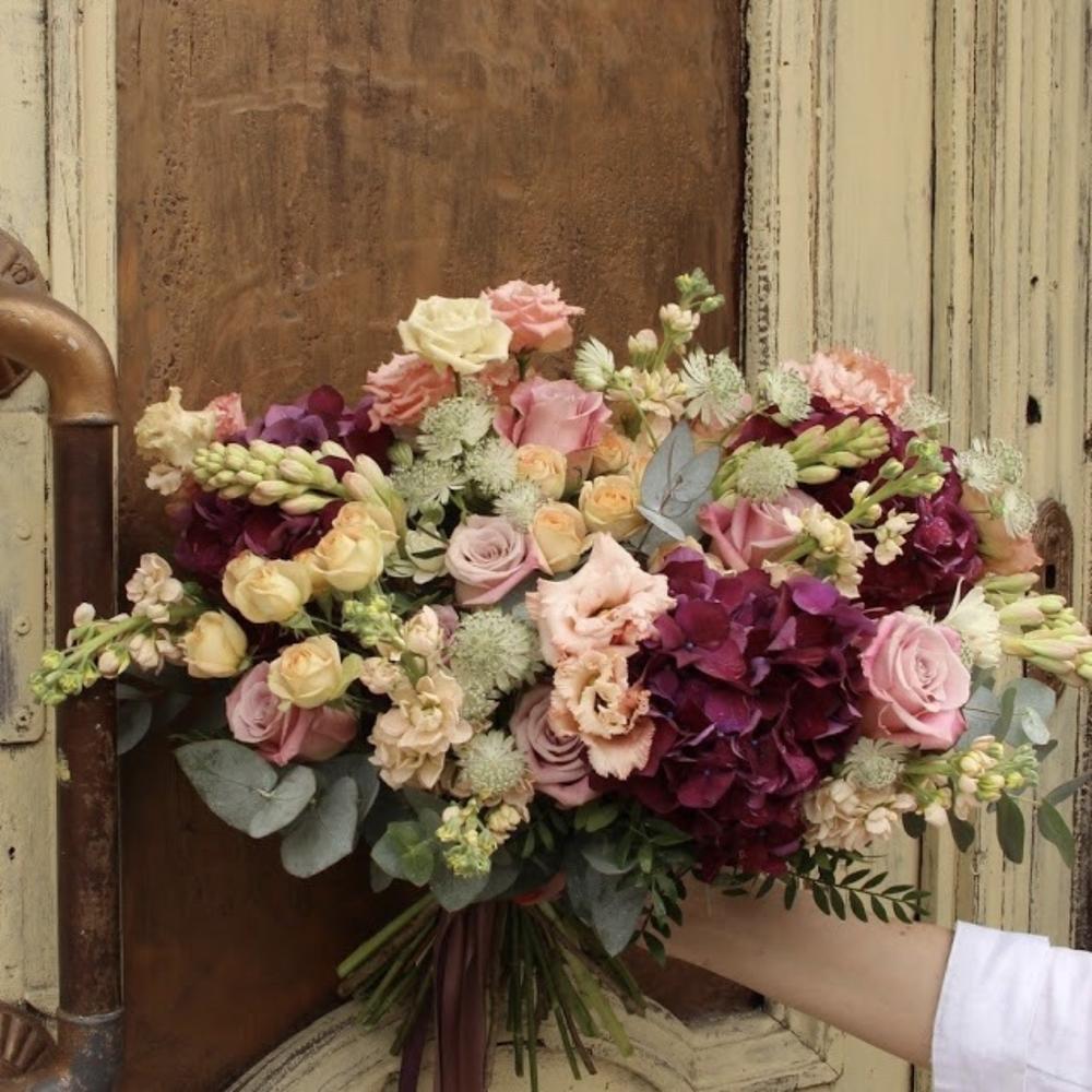 Раскидистый букет с гортензиями, эустомой, розами, маттиолой и эвкалиптом.Стильное цветочное решение для любого случая.Ширина букета около 60 сантиметров, высота букета около 60 сантиметров.