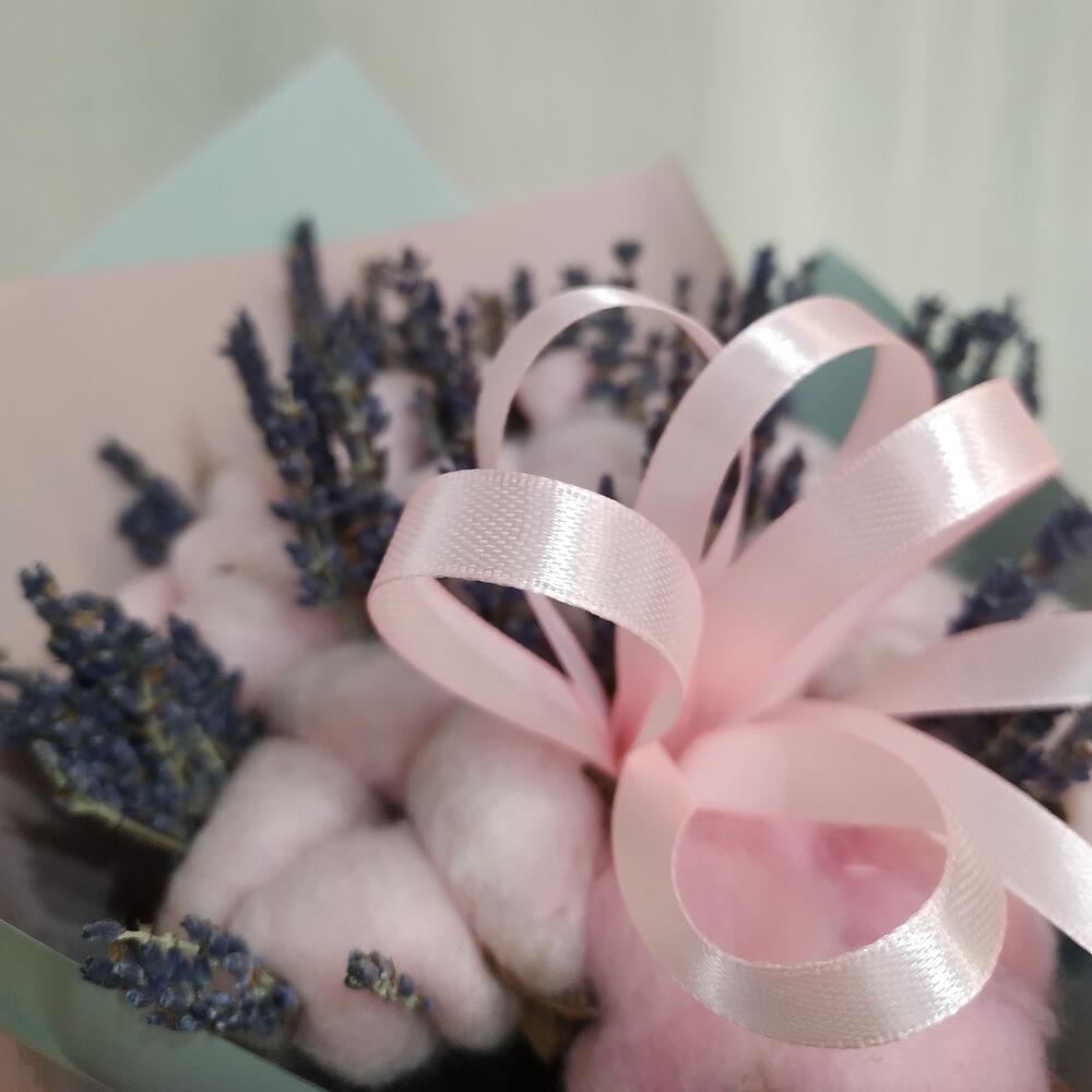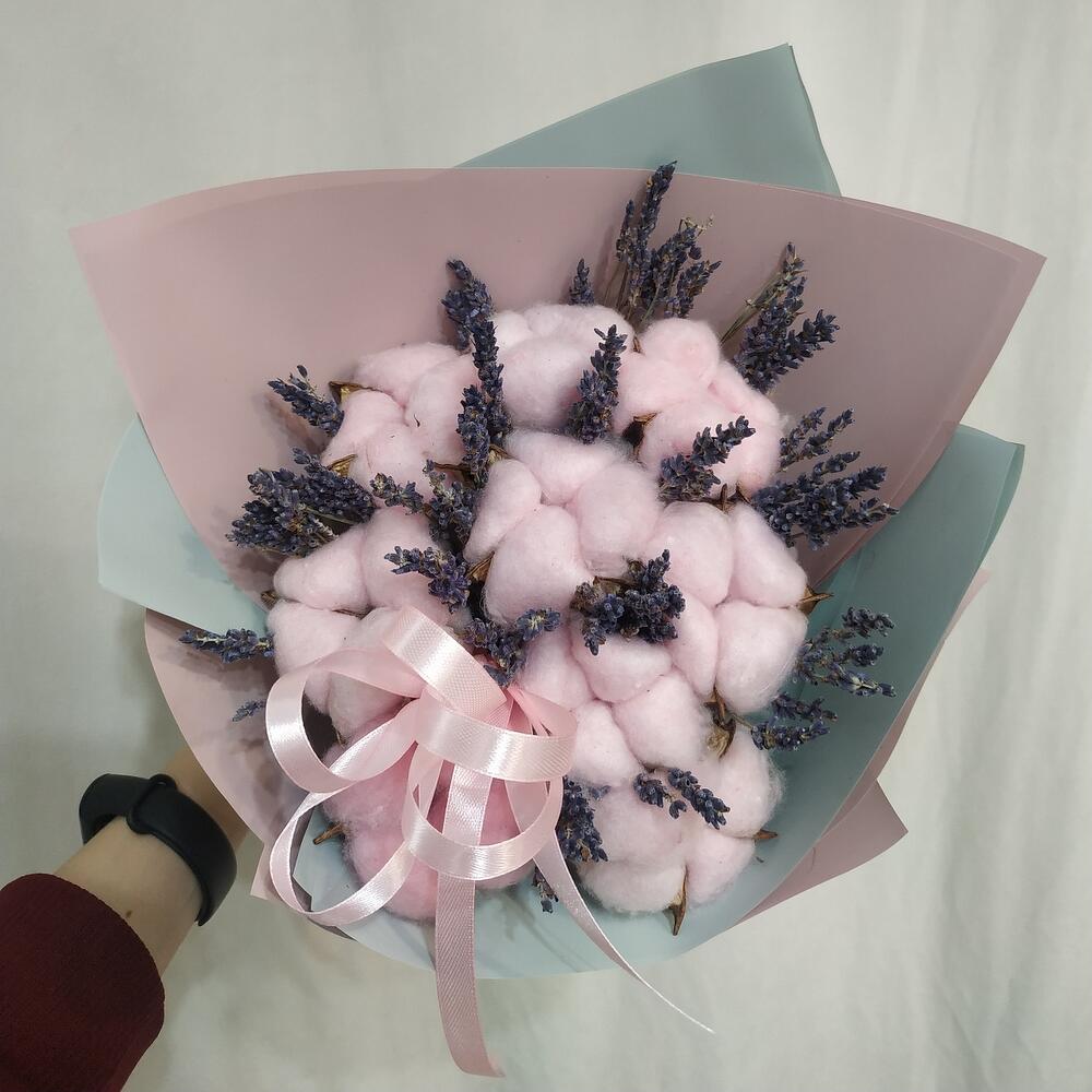 «Лавандовое созвездие» Букет из розы, гвоздики, статица и хлопка