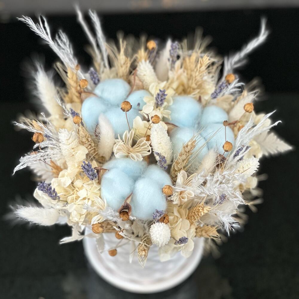 Кашпо керамическое – 1 шт.Оазис – 1 шт.Хлопок – 3 шт.Гортензия – 1 шт.Лаванда (сухоцвет) – 10 шт.Сухоцветы – 20 шт.
