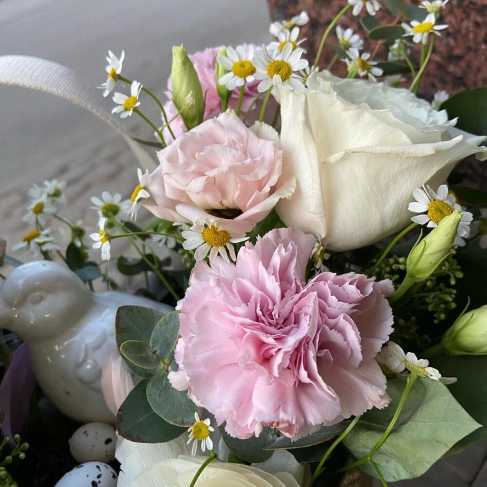 Верба – 3 шт.Корзина – 1 шт.Лизиантус – 1 шт.Тюльпан – 4 шт.Оазис – 1 шт.Матрикария – 1 шт.Фисташка – 2 шт.Птица декоративная – 1 шт.Хелеборус – 1 шт.березовые ветки – 3 шт.